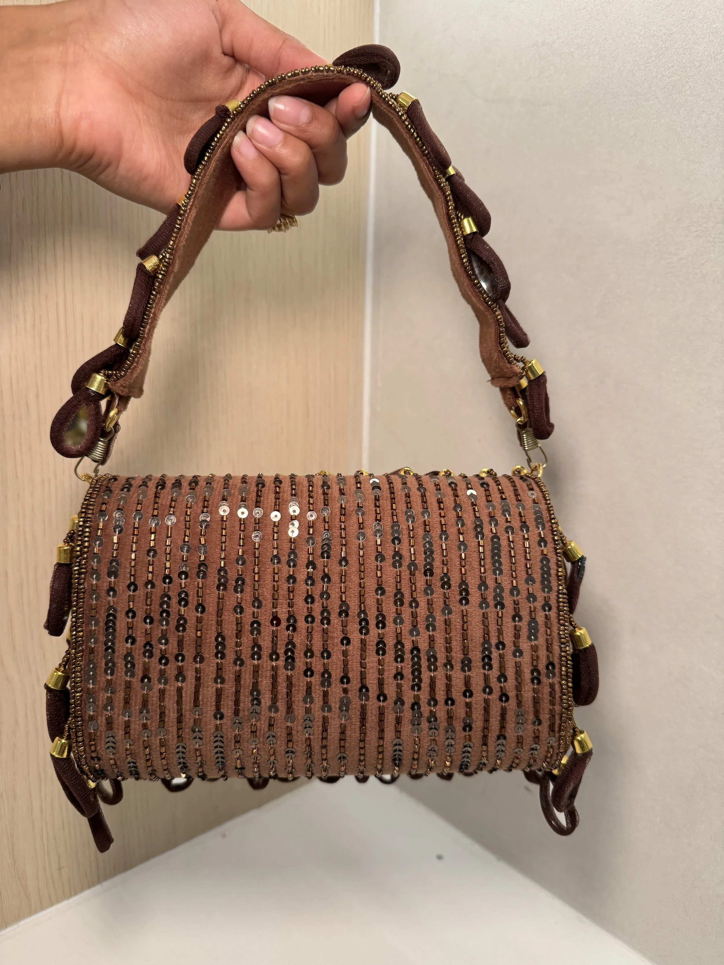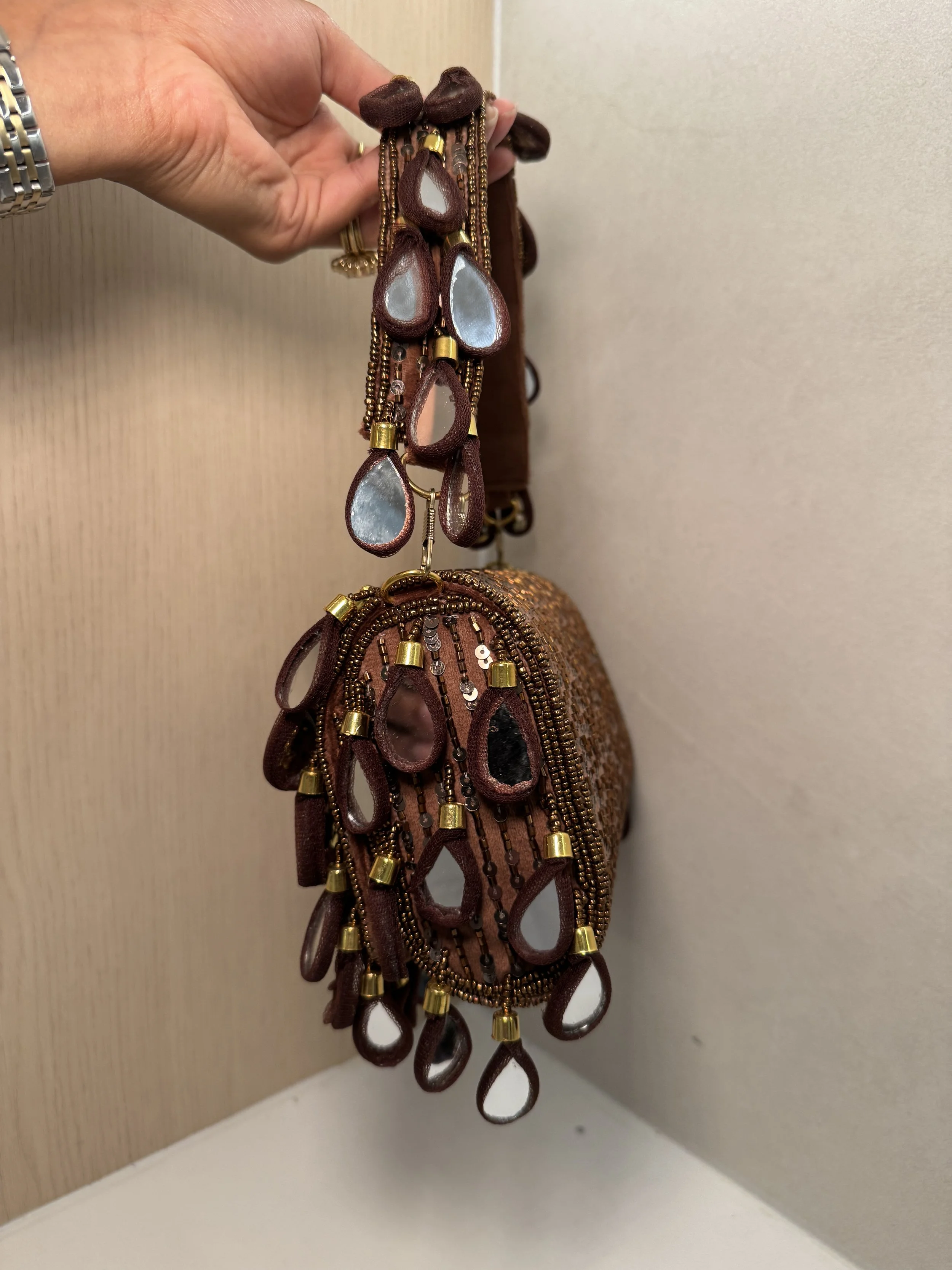 The Dusky Brown Mirror Drop Purse is rooted in tradition but walks with a modern edge. Its warm tones, mirror tassels, and caramel-hued body whisper stories of chai in clay cups and golden-hour light. It's subtle, yet unforgettable.